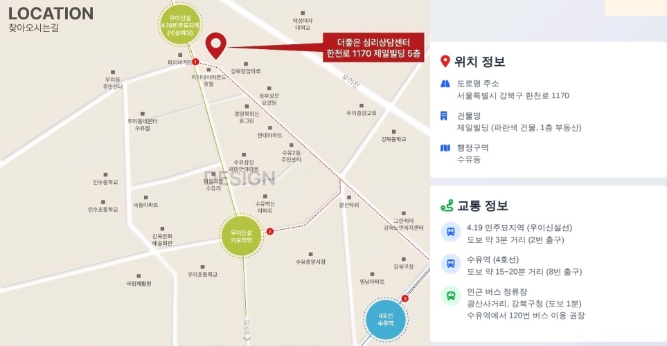 네비게이션에 ‘서울특별시 강북구 한천로 1170’ 또는 ‘수유동 279-79’으로 검색해주세요.